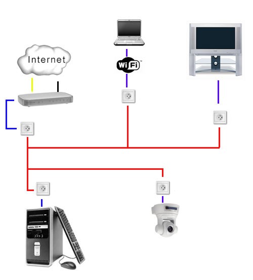 quelques applications du courant porteur 2/3 Dans ce cas très simple, chaque ordinateur est relié à un adaptateur CPL. Les trois adaptateurs quant à eux, sont reliés à des prises électriques. C'est la façon la plus simple de créer un réseau local par courant porteur.