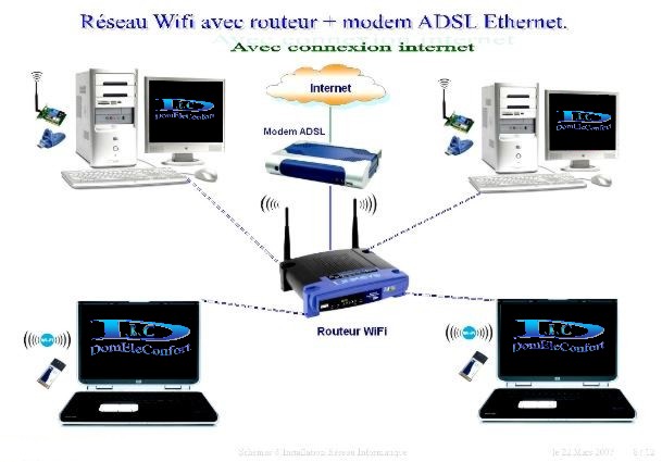 Réseau Wifi avec routeur modem ADSL intégré.