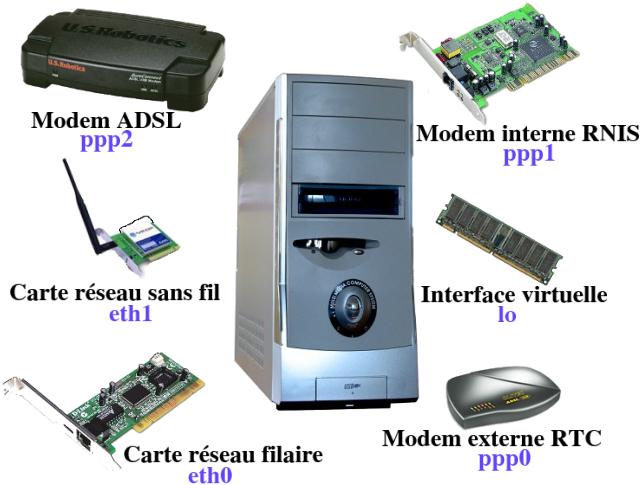 Réseau Wifi avec routeur + modem ADSL Ethernet.